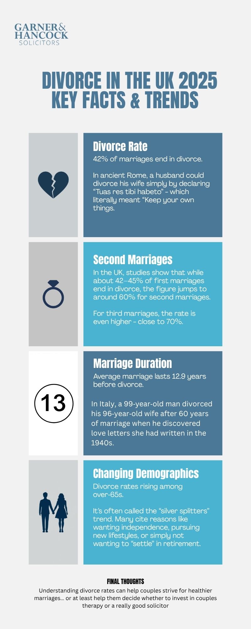 Divorce is one of the most significant life events a couple can face, and the way it’s understood has shifted dramatically over time. From ancient customs to modern no‑fault laws, the story of divorce is as much about society as it is about relationships. Here’s a look at the latest UK divorce statistics, alongside some surprising and even quirky facts.